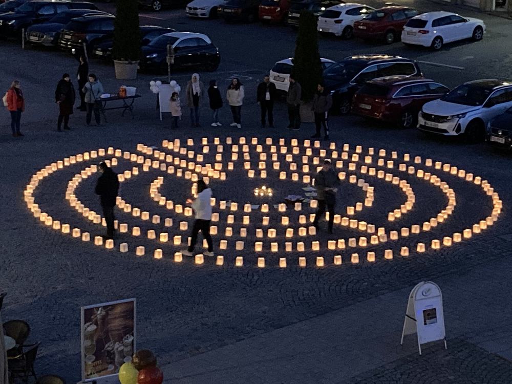 Die Menschen wurden eingeladen, ein Teelicht in einem Glas in die Mitte zu tragen. Es erforderte große Anstrengung, es brauchte oft mehrere Versuche. So verletzlich wie die kleine Flamme ist der Friede... Ein Friedenstext aus der Mitte begleitet die TeilnehmerInnen in den nächsten Tagen...